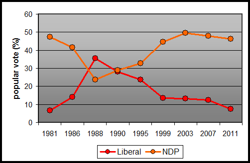 A recharged Liberal party would be bad news for the NDP, because the Liberals and the NDP tend to share the same voter pool, whereas the PC vote is less related to either party. In others words, an increased Liberal vote means a decreased NDP vote.