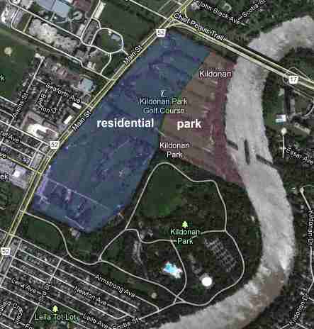 Windsor Park: The Windsor Park golf course would be more difficult to develop because the access points are not good. Bordered by the Seine River on the west, Archibald and the CP Emerson line to the east, the St Boniface Golf Course and cemetery to the north, and a quiet residential neighbourhood to the south, there are no major intersections to build off of and no good way to get traffic in and out.