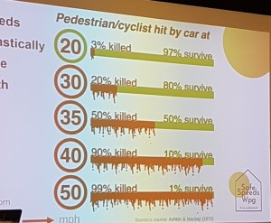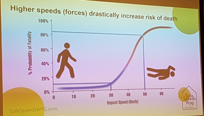 It started off well with a couple of very thoughtful presentations explaining the benefits of lower speeds. The presentations included the familiar S-curve diagram showing the non-linear relationship between speed and fatalities ..